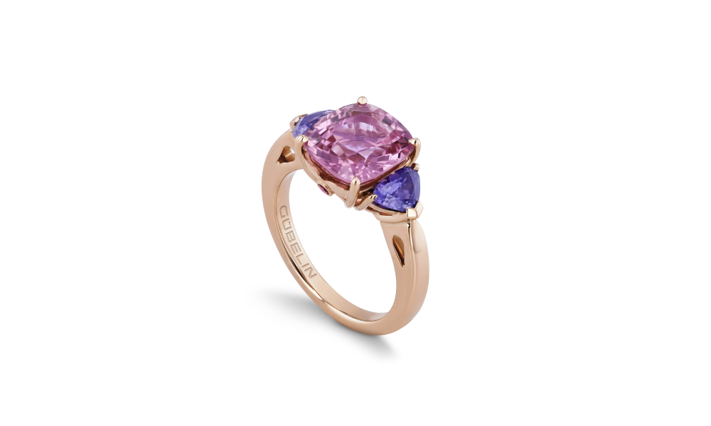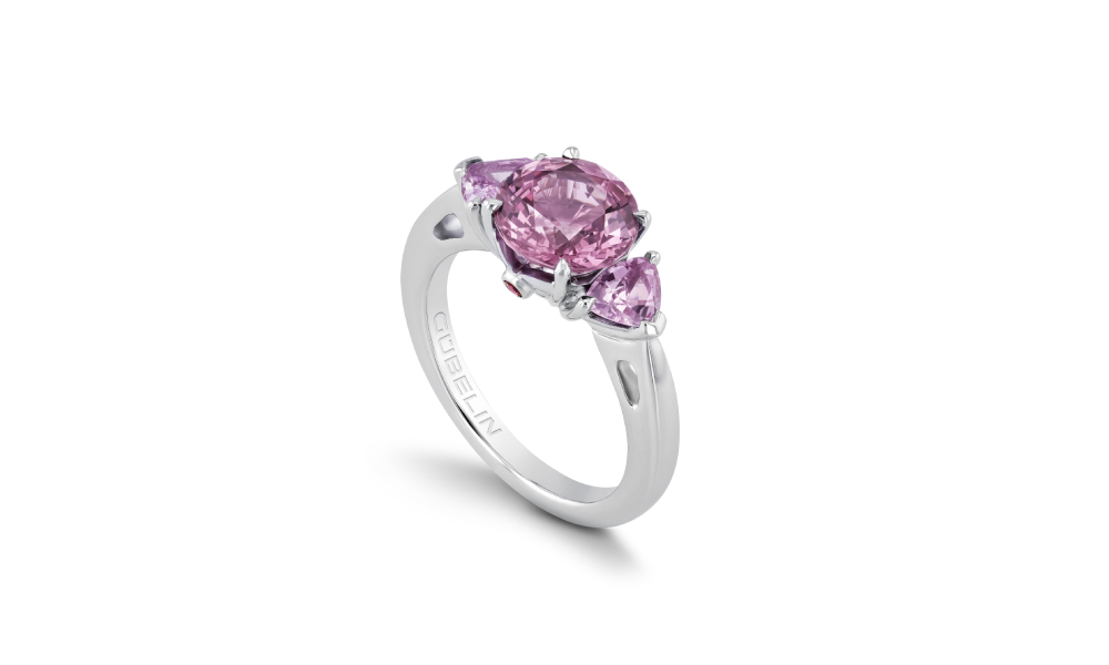 This white gold ring is set with gemstones belonging to a family of colours. The 2.73-carat pink spinel from Burma (Myanmar) is accompanied by two pink sapphire trilliants. The iconic Gübelin ruby adds a glittering red highlight.