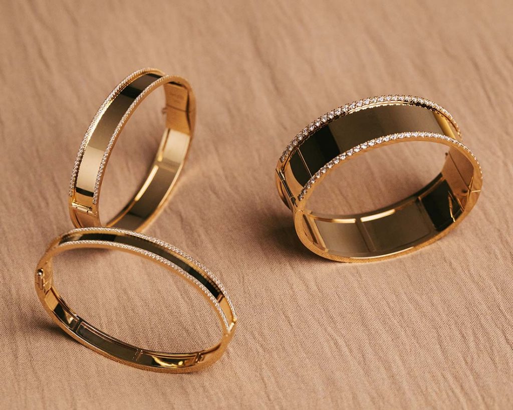 The Lumière line explores the innately pure character of gold, the singular element, along with diamonds. “The luminosity of gold and the scintillating effect of diamonds is mirrored in the simplicity of the design.” The collection features round, baguette, pear, marquise and princess-cut diamonds across the hoops, rings, bangles, and chain-pendants.