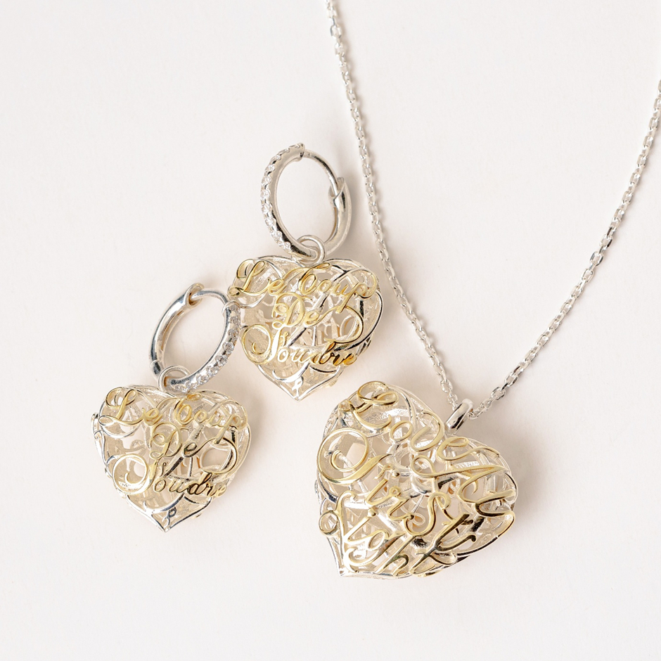 Crafted in 18-karat yellow gold and set with natural diamonds and sterling silver, the “Le Coup de Foudre” collection features intricate three-dimensional heart-shaped pendants (20mm & 30mm) and earrings.