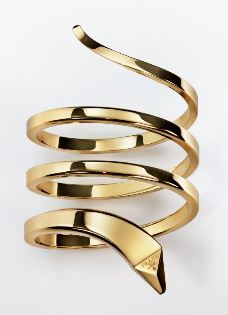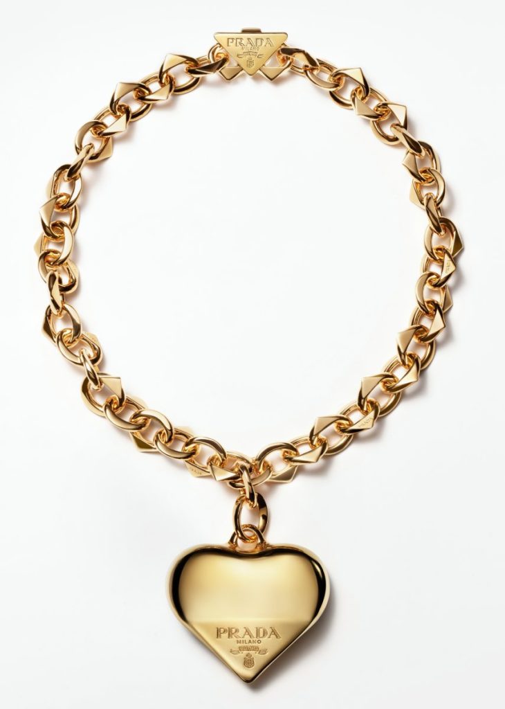At the core of the collection is the Prada triangle – a powerful silhouette that has become synonymous with Prada. The triangle appears in every piece as a clasp closure, earrings and pendants, while its angles shape chain links and hearts, the head of a snaked bracelet. Gold is the focus in this debut collection, consisting of snake bracelets, heart motifs, chain necklaces, and ribbon chokers.