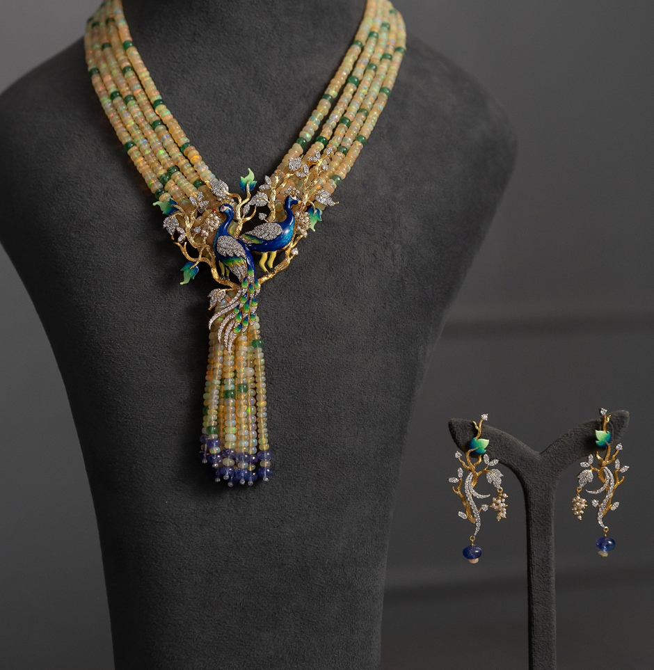 Multi-strand necklace is beautified with opals, centred on a diamond foliar pendant with enamelled peacocks, while the earrings mimic the same design language. By Sankesh Surana