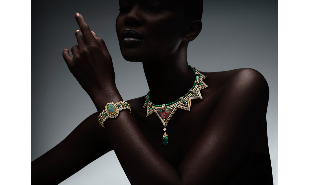 It begins with Savoir, a secret knowledge that must be protected and guarded. Dressed in 30.56-carat Australian black opal, custom-cut in a rare triangle shape, is paired with chevron shapes and Vs, harnessing the codes of the house.