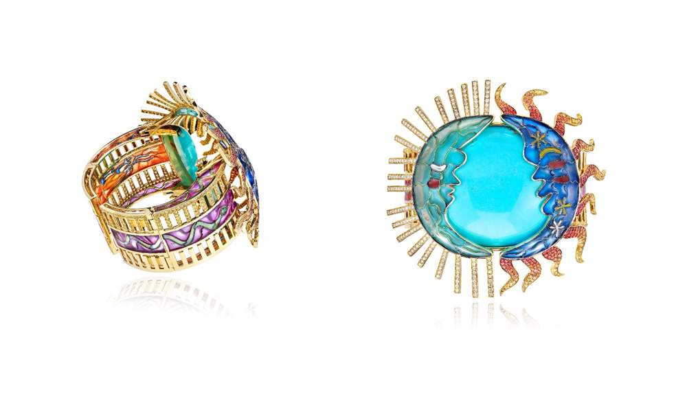 The 18-karat gold bracelet is set with diamonds, yellow and orange sapphires, and turquoise. The bracelet is a quintessence of light, both visually and spiritually, thanks to the precious effects of the plique-à-jour enamel; it features the rare celestial activity when the Mother Earth, Moon and Father Sun meet each other.
