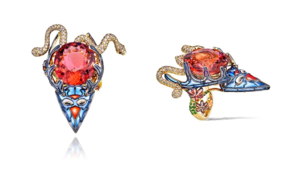 The 18-karat gold ring, patterned with brown diamonds, black spinel, tsavorite, a 23-carat tourmaline, and yellow beryl, resembles a deer’s head that the shaman carries during the celebration. It symbolises the transformation of the deer deity, ablaze with fire. The intertwined snakes represent the thoughts through which Kauyumari implores for rain and abundance.