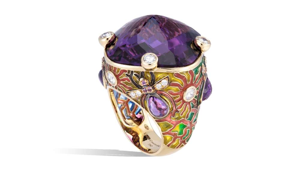 Inspired by the artwork ‘The Bees Find Their Way to the Hive’ by de Yauxali, 1981, it depicts their journey to the hive, thanks to their nierikate spinning within the four cardinal directions. In the artwork the crosses are located on the four parts of the hive to symbolise that the bees are everywhere to make votive candles. The 18-karat gold ring evokes the scene with the use of plique-à-jour enamelling, diamonds, drop-shaped amethysts, and a 36.87-carat amethyst adorning the centre.