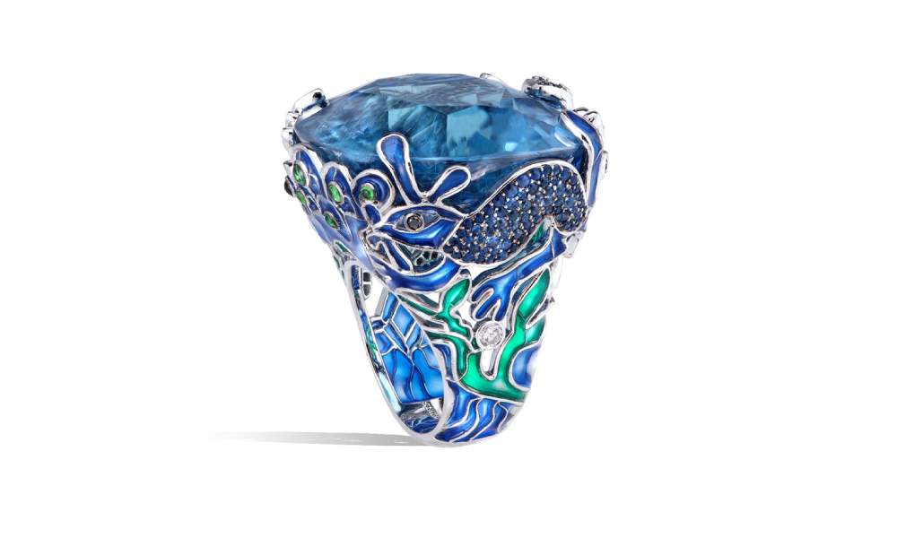 The 18-karat gold standout ring studded with black and white diamonds, tsavorites, sapphires, a 106.6-carat blue tourmaline, and adorned with plique-à-jour enamelling, tells the story of the birth of fire, the origin of the moon, the sun, or the stars. The most ancient roots of Huichol art can be seen in their stone carvings offered in sacred places.