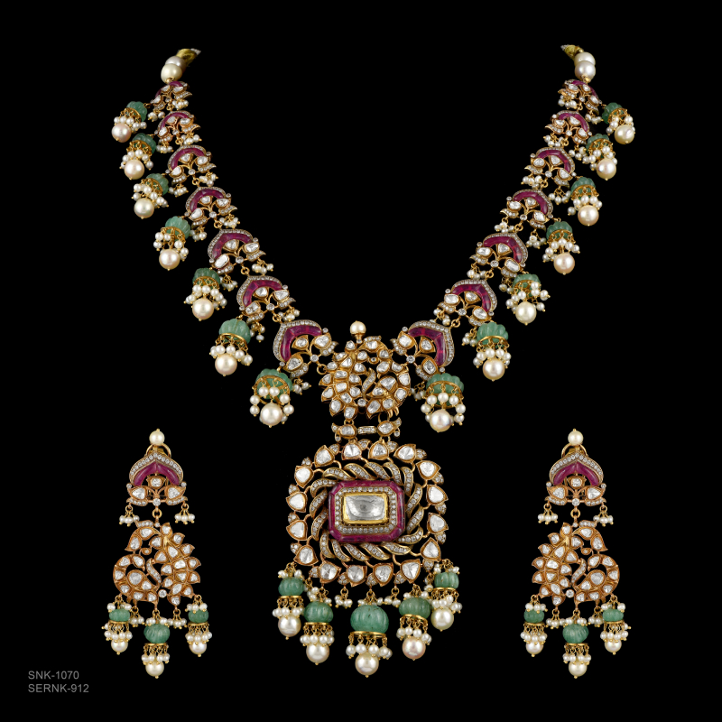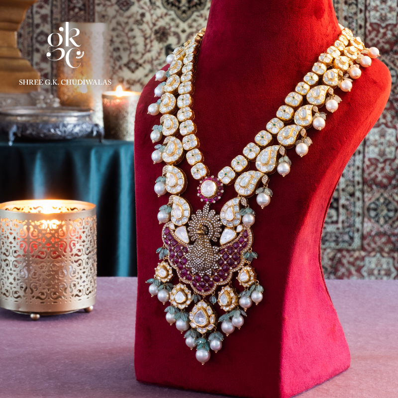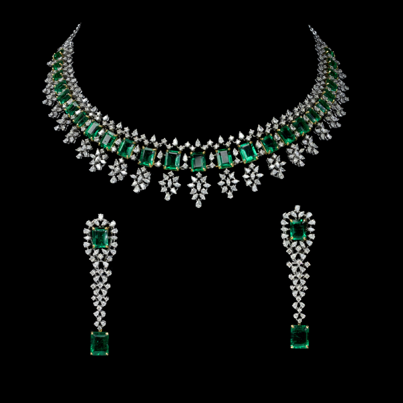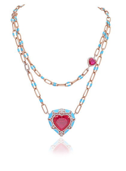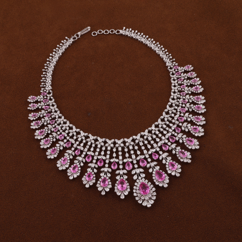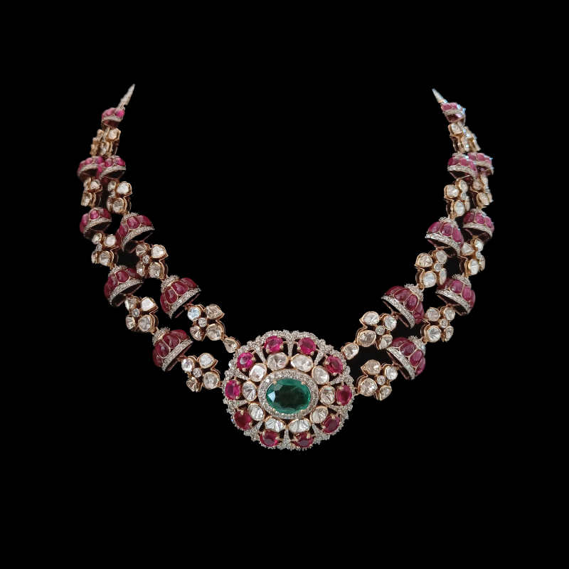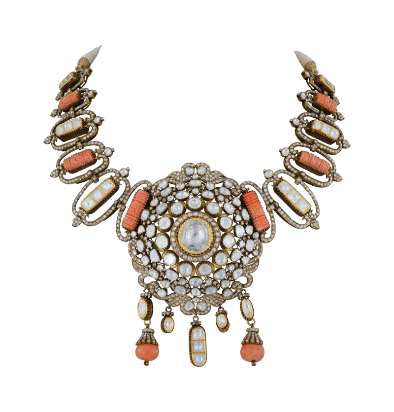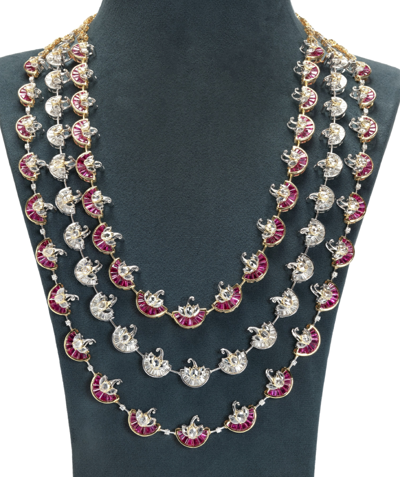 A magnificent bridal necklace composed with diamonds and rubies. By MANOJ ORNAMENTSDesigned as a drape with tassels, the white gold necklace is encrusted with fancy-cut diamonds. By ZUNDAAThe two-row ruby and polki necklace adorned with bell-shaped motifs focuses on a floral pendant studded with rubies, polkis, and a faceted oval emerald. By DIAGOLDThe two-row gold link chain is adorned with a heart-shaped pendant realised with a large ruby framed with diamonds and sky-blue ceramic outline. By TARA FINE JEWELSA lacy couture necklace wrought in 18-karat white gold is composed of elongated diamond and sapphire motifs lending a sophisticated touch to the piece. By DHANRUPJI DEVAJI & CO. (ANAND RANAWAT)Long gold pendant necklace set with danglers earrings, crafted with 18-karat gold and 24-karat kundan, and embellished with polkis, melon-cut emeralds, ruby talafs, diamonds, and pearls. By GIE GOLD CREATIONS PVT. LTD.Three-row gold necklace adorned with channel-set baguette rubies and rose cut tulips motifs. By NEETTI ATELIERA symmetrical gold necklace lined with emeralds, each suspending a floral motif. The necklace set is further adorned with fancy-cut diamonds. By KULTHIAA JEWELThe heavy bridal necklace features a single row of square polki motifs accompanied by a row of paisleys, each suspending a large pearl. The central motif displays a stylised bird with its wings beautified with rubies. The necklace is set with emeralds and diamonds. By SHREE GK CHUDIWALASA resplendent gold bib designed with emeralds and diamonds. By PEACEMOON TRADERSA contemporary take on jadau necklace, the versatile piece is adorned with coral, pearls, and polkis. By RAMBHAJOS