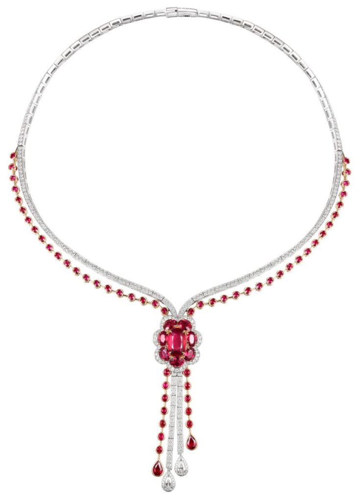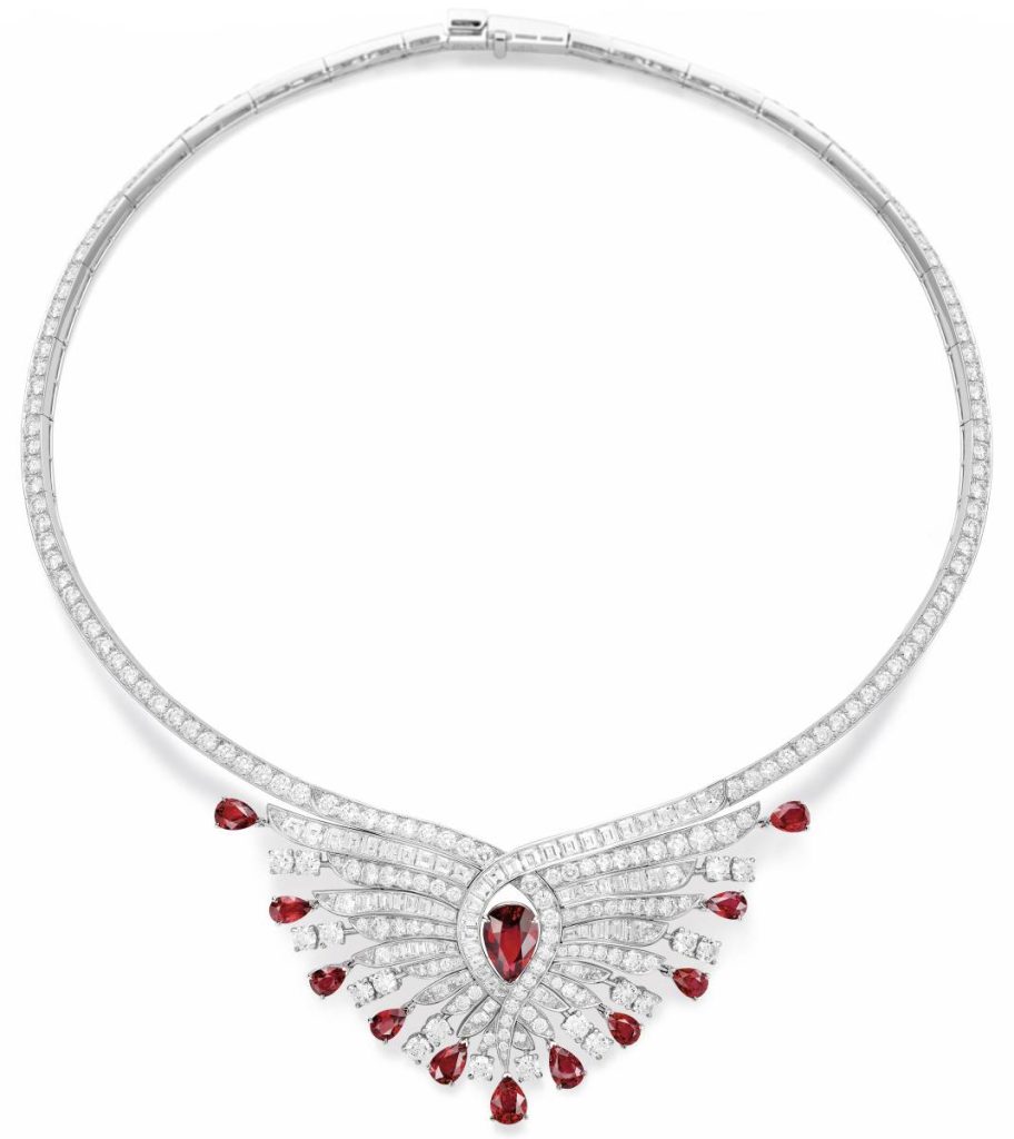 The Blazing Night 18-karat white gold necklace is set with a pear-shaped Mozambican ruby of approximately 4.03 carats, 11 pear-shaped rubies from Mozambique and Thailand weighing 7.07 carats), baguette-cut and brilliant-cut diamonds. By PIAGET