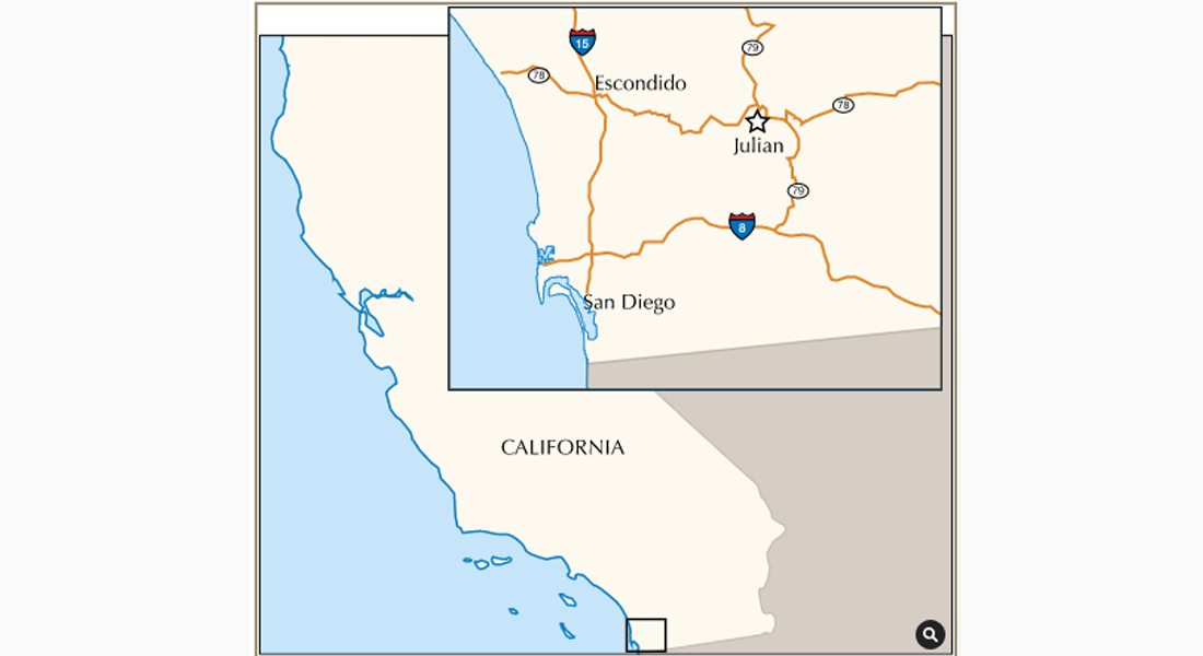 Located about 60 miles east of San Diego, a new emerald deposit has been discovered in the Julian Mining District (figure 1). This area is known for pegmatite mines and hydrothermal mineral deposits; however, none of those are known to have produced emeralds to date. The emeralds (example shown in figure 2) were all collected by author RE and son Bruce Edley near the surface and are embedded in a biotite schist host rock. Most of the recovered single crystals have a translucent dark green color and inclusions, and they are typically smaller than 2 cm. A few light-colored green beryl crystals have been recovered from a nearby pegmatite. Their formation was likely correlated with metamorphic and hydrothermal processes associated with regional tectonism.