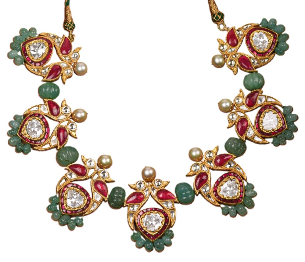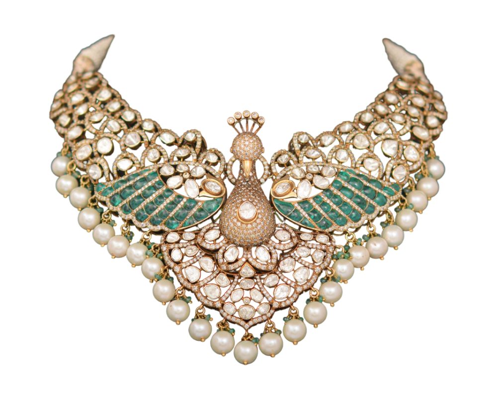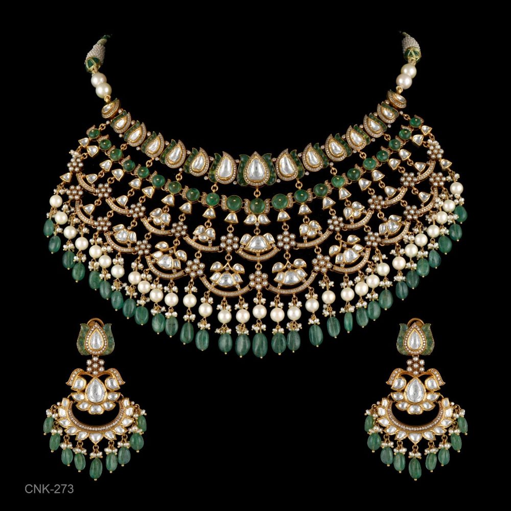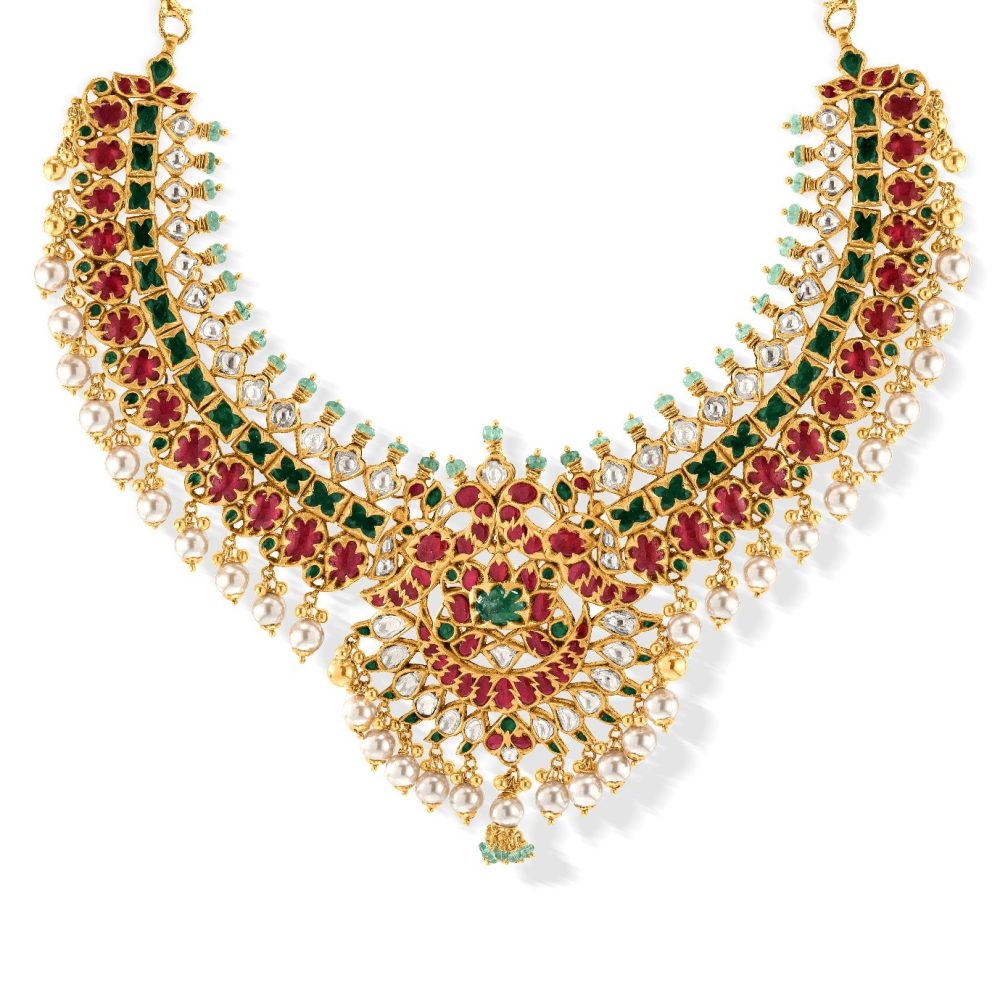 The grand necklace begins with a row of polki-set paisley motifs and transitions into a lace of jewels featuring dainty florets patterned with emeralds, polkis, and pearls. By GIE Gold Creations Pvt. Ltd.The bridal necklace set features a delicate lattice adorned with pastel-hued gemstones such as aquamarines, pink quartz and polkis. The entire lace is embellished with diamonds of various shades. By Bariki JewelsThe yellow gold handcrafted necklace showcases rows of melon-cut emeralds, polkis, and rubies, with a grand central motif. The entire necklace is adorned with rows of pearls. By S K Seth JewellersThe nature-inspired bib in gold is teeming with buds articulated by emerald beads, and filigreed openwork florets accented with diamonds. The necklace is finished with a line of brushed gold beads. By Ansaa JewellersAlluring two-row gold necklace composed of asymmetrical vibrant polkis, interjected with ruby blossoms. By Dassani BrothersAntique-finish gold necklace studded with pearls and polkis, suspending graduating etched gold motifs featuring deities. Each motif is lavishly adorned with polkis and pearls. By Karni JewellersThe resplendent V-shaped choker, enriched with polkis, features an artistically crafted peacock at its centre, adorned with emeralds and polkis. By Raniwala JewellersThe 22-karat gold necklace showcases Indian artistry. Handcrafted to precision, the etched rows of patterns, interspersed with shiny gold beads, adds to the beauty of this bridal piece. By Aalishaan by Royal ChainsThe single-row gold necklace is patterned with elaborate motifs, each adorned with a pearl, melon-cut emeralds, polki, ruby leaves, and a large uncut emerald framed with channel-set rubies. By Haritsons Designs Pvt. Ltd.