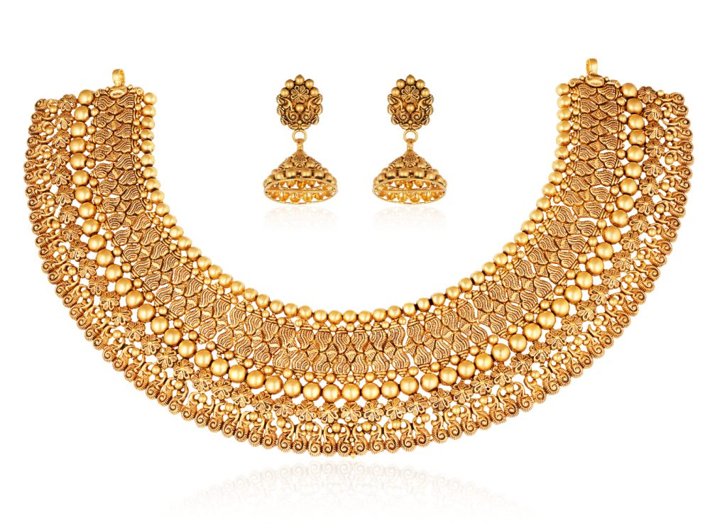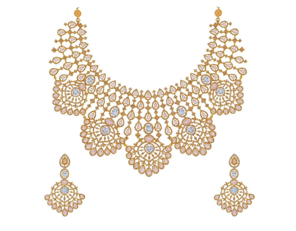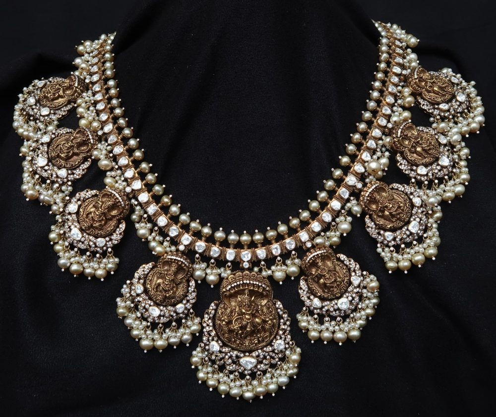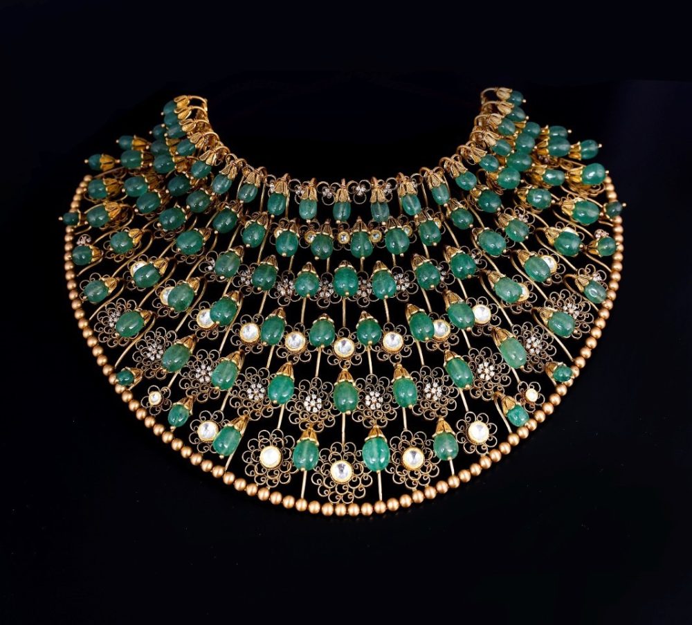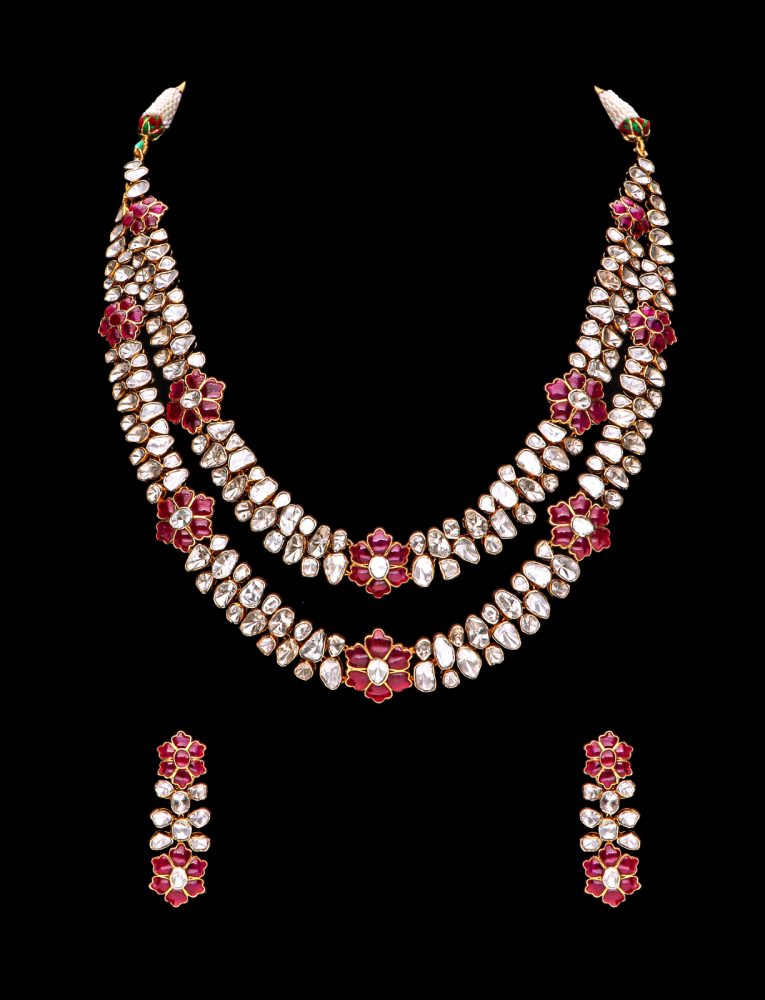 The grand necklace begins with a row of polki-set paisley motifs and transitions into a lace of jewels featuring dainty florets patterned with emeralds, polkis, and pearls. By GIE Gold Creations Pvt. Ltd.The bridal necklace set features a delicate lattice adorned with pastel-hued gemstones such as aquamarines, pink quartz and polkis. The entire lace is embellished with diamonds of various shades. By Bariki JewelsThe yellow gold handcrafted necklace showcases rows of melon-cut emeralds, polkis, and rubies, with a grand central motif. The entire necklace is adorned with rows of pearls. By S K Seth JewellersThe nature-inspired bib in gold is teeming with buds articulated by emerald beads, and filigreed openwork florets accented with diamonds. The necklace is finished with a line of brushed gold beads. By Ansaa JewellersAlluring two-row gold necklace composed of asymmetrical vibrant polkis, interjected with ruby blossoms. By Dassani BrothersAntique-finish gold necklace studded with pearls and polkis, suspending graduating etched gold motifs featuring deities. Each motif is lavishly adorned with polkis and pearls. By Karni JewellersThe resplendent V-shaped choker, enriched with polkis, features an artistically crafted peacock at its centre, adorned with emeralds and polkis. By Raniwala JewellersThe 22-karat gold necklace showcases Indian artistry. Handcrafted to precision, the etched rows of patterns, interspersed with shiny gold beads, adds to the beauty of this bridal piece. By Aalishaan by Royal ChainsThe single-row gold necklace is patterned with elaborate motifs, each adorned with a pearl, melon-cut emeralds, polki, ruby leaves, and a large uncut emerald framed with channel-set rubies. By Haritsons Designs Pvt. Ltd.