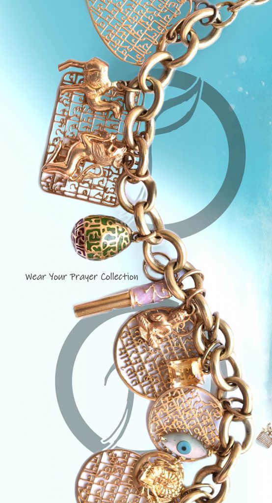 Years later, a good friend, who was going through difficult circumstances, asked me to make something for her that would give her strength. I thought of my grandfather and his chanting of the mantra during our walks. Merging two strong influences, the iconic Fabergé egg and my late grandfather, I designed the Prayer Egg collection — drop pendants with the prayers of ten different faiths on them.
