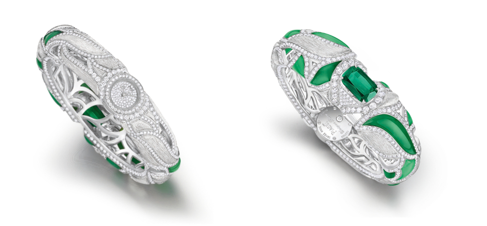Foliatura, a jewellery watch is set with a vibrant cushion-cut Colombian emerald weighing 6.59 carats. Stylised chrysoprase leaves set with intertwining diamonds adorn its white gold body. Ingeniously placed on the lower part of the band, the watch dial allows the wearer to read the time discreetly.