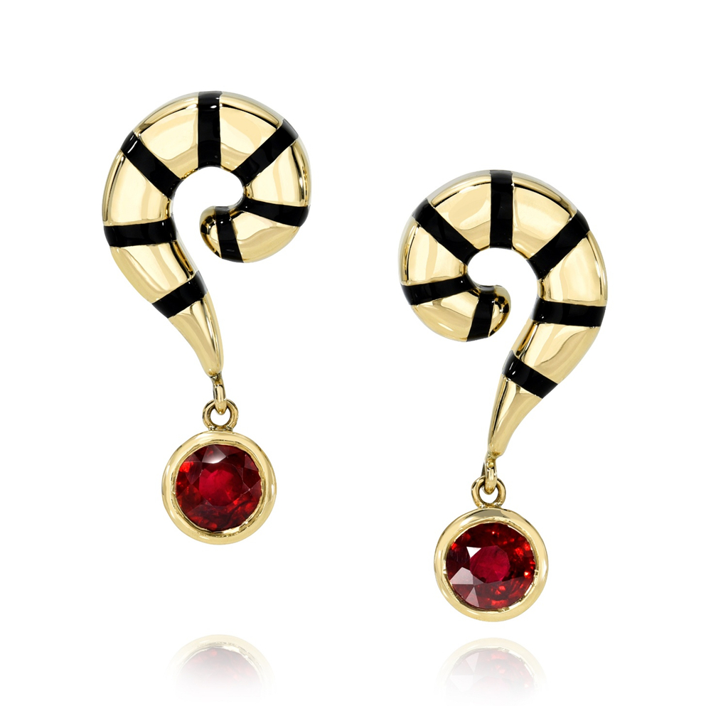 Handmade in 18-karat yellow gold, these earrings feature brilliant Gemfields rubies from Mozambique and stripes of black enamel inlay. By Rachel Quinn x Gemfields