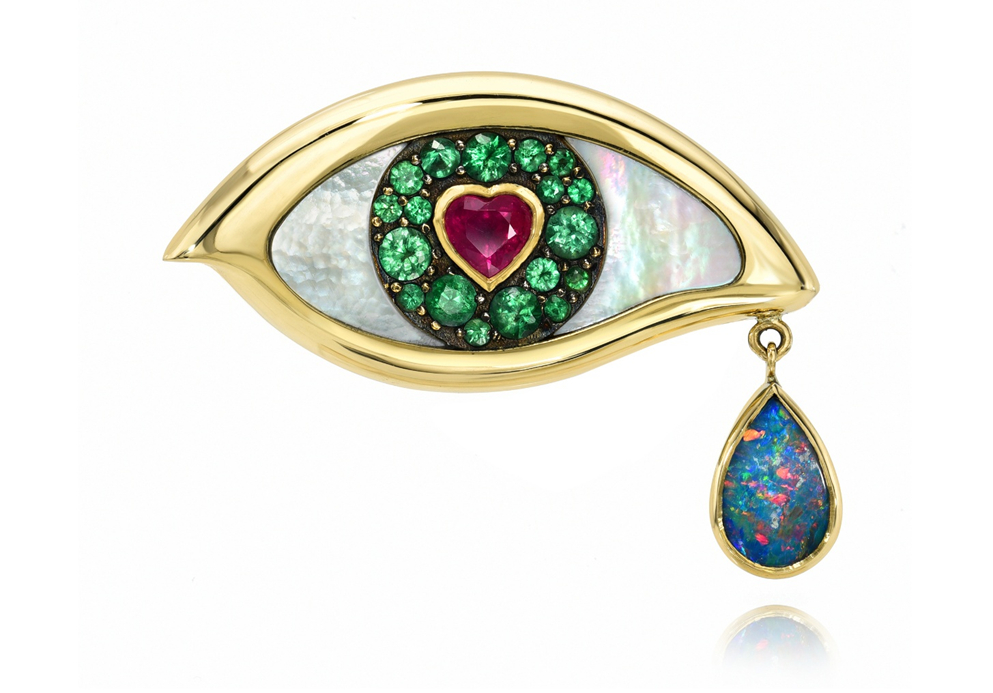 Symbolising the bittersweet vulnerability in budding love, this one-of-a-kind 18-karat gold brooch features a ruby heart encircled by an iris of verdant emeralds, all set within mother-of-pearl inlay. The opal tear drop dangles from the corner of the eye. By Rachel Quinn x Gemfields Lover’s Eye Brooch