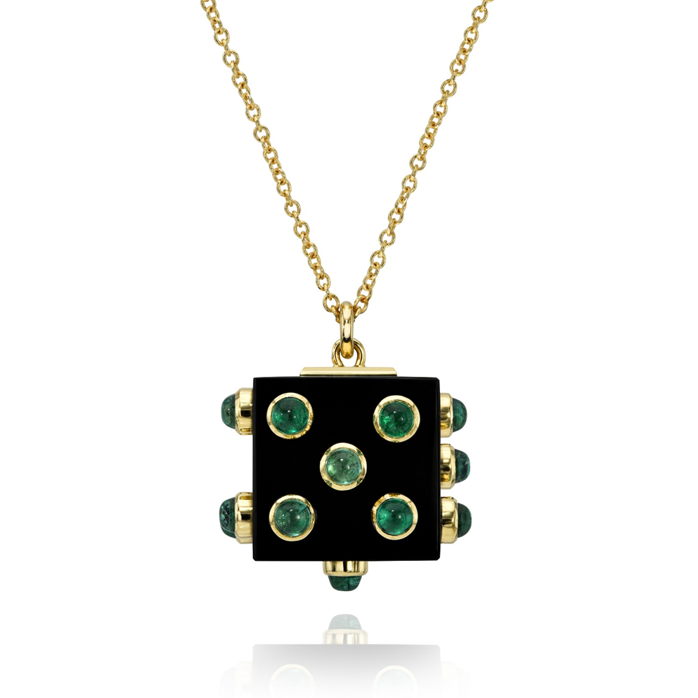 The oversized 18-karat yellow gold single die is a playful reminder that the best things in life are a roll of the dice, especially love. Crafted with hand-carved black quartz, the pips are fashioned with Gemfields’ luminous emerald cabochons from Zambia. By Rachel Quinn x Gemfields