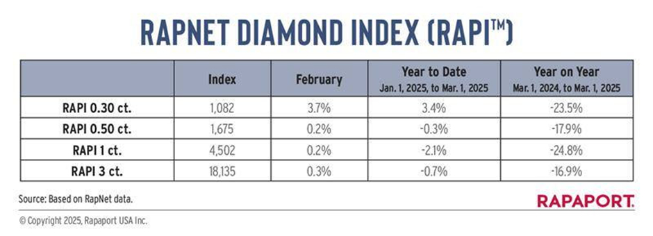 The RapNet Diamond Index (RAPI™) for 1-carat diamonds — reflecting round, D to H, IF to VS2 goods — increased 0.2% in February. The index for 0.30-carat diamonds rose 3.7%, with strong demand for D to E, IF to VVS1 qualities. The 0.50-carat RAPI went up 0.2%, and 3-carat prices climbed 0.3%.