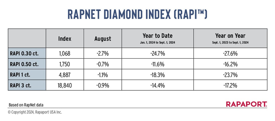 The RapNet Diamond Index (RAPI) for various carat weights saw declines, with the index for 1-carat round, D to H, IF to VS2 diamonds falling by 1.1%. The removal of Chinese diamond listings from RapNet on 21st August due to low prices and additional fees contributed to a technical increase in the index.