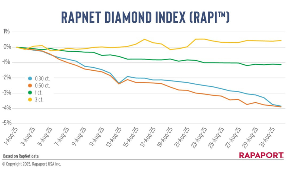 The RapNet Diamond Index (RAPI™) for 1-carat goods — reflecting round, D to H, IF to VS2 diamonds — fell 1.1% in August. The index for 0.30- and 0.50-carat stones declined 3.8% and 3.9% respectively. Larger stones continued to outperform smaller items, with the 3-carat RAPI increasing 0.4%.