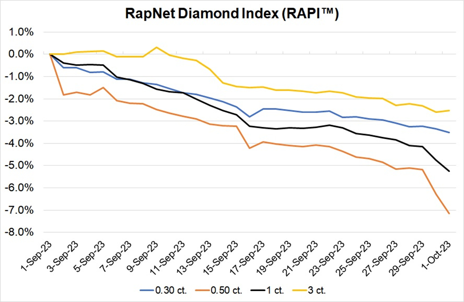 The RAPI only reflects D to H colours and IF to VS2 clarities. Prices for 1-carat, D-L, SI1-SI2 items on RapNet fell 6.8% during September.
