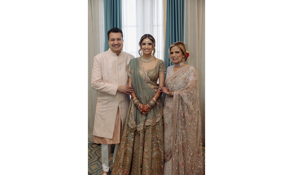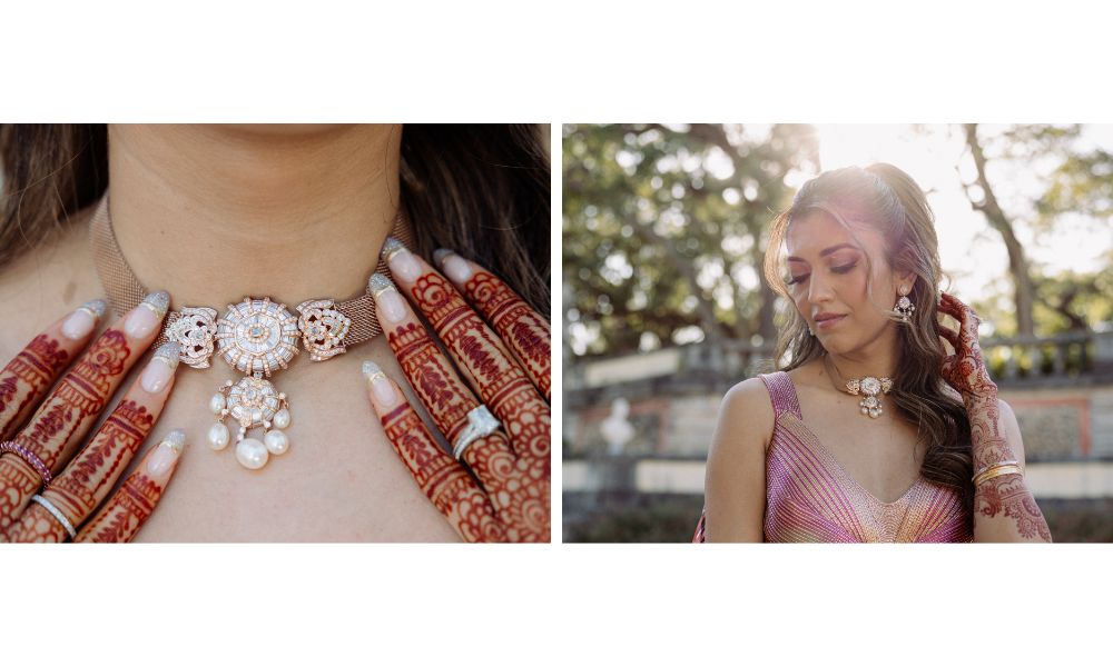 (Left) A close-up of the custom-designed gold choker by Moksh reveals a stunning double-drop circular pendant enriched with baguette and round diamonds, elegantly fringed with pearls. Flanking the centrepiece are two curvaceous diamond-studded motifs add to the allure. The rings, studded with natural diamonds and gemstones, are designed by TriJewels. (Right) The bride in full splendour.Jyoti, the bride’s mother, radiates elegance in a bespoke necklace adorned with two rows of stylised drop motifs and fancy-shaped diamonds. The necklace is accentuated by tanzanite drops, perfectly complementing her structured ensemble which she wore for the Sangeet ceremony. Jewellery by MokshFor the wedding ceremony at Biltmore Miami, the bride, in a Shyamal & Bhumika ensemble, looked magnificent in a broad choker populated with diamonds and interwoven pearls. The chand bali earrings and the maang tika (hair ornament) perfectly complement the choker. Apart from stacking bangles, she wore a statement haath phool (bangle-cum-ring) adorned with delicate diamond and woven pearls. All jewellery was designed by Moksh.Ashna poses with her parents, Jyoti and Vijay Bhatia, owner of TriJewels, before she heads to take her wedding vows (saat pheras).An intimate moment shared with her mother, Jyoti, at the wedding mandap. The bride’s mother, also in Shyamal and Bhumika, matches the elegance of the event with a diamond and pearl choker, paired with gold and diamond hoops and mang-tikka of similar design, all jewellery was designed by Moksh. The wedding bands and engagement rings were designed by TriJewels.The wedding is solemnised, marking the beginning of Ashna and Smit’s joyous journey together!For the final event of the wonderful weekend, at the reception, Ashna wore a golden Zara Umrigar ensemble and added Moksh’s single-line geometric gold necklace patterned with baguette diamonds and the linear earrings.