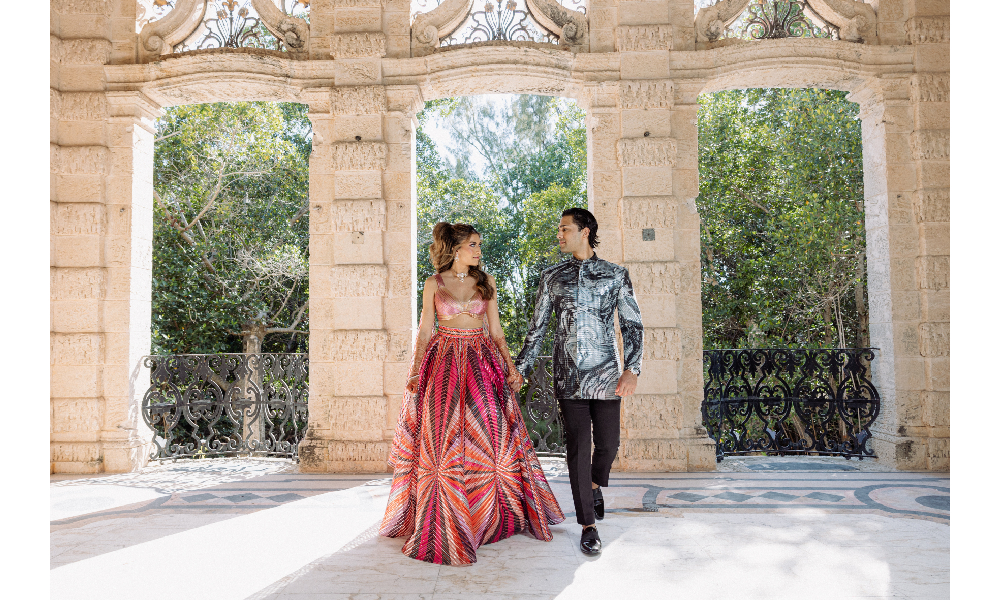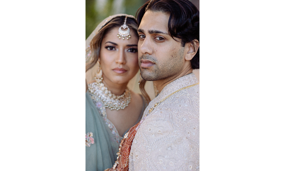 Ashna and Smit dubbed their wedding weekend “Ashna & Smit Kii Prem Kahani.” For the Sangeet, Ashna wore Amit Aggarwal and custom fine jewellery by Moskh, and for the reception, in the glorious Biltmore ballroom, Ashna and Smit paid tribute to their ‘rose-coloured’ future. That night, Ashna wore Zara Umrigar with a brilliant baguette necklace and earring set by Moksh, and Smit looked handsome in a Manish Malhotra suit.