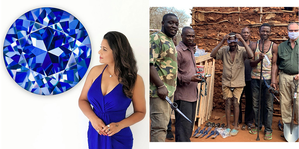 Reena Ahluwalia, the Canada-based award-winning jewellery designer and artist, created a Tanzanite painting for a charity raffle, donating 100% of the proceeds to Gem Legacy, an NGO active in East African coloured gemstone mining communities. Gem Legacy was started by renowned American gem cutter Roger Dery of Roger Dery Gem Design who is celebrating his 40th year in business and 40th visit to the African continent.