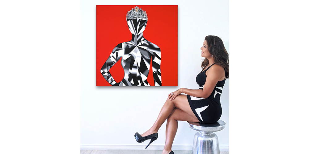 Using colours red and black to depict passion and strength, Reena’s painting has an empowered woman in the form of a diamond wearing the Power of Unity crown. Reena envisioned the diamond woman figure filled with light, limitless potential, who confidently carries the resolve of being an agent of unity and greater societal good.