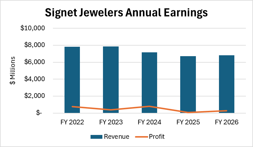 Signet is effectively saying that consumers are buying less often but spending more when they do. It is moving to a model that protects margins and leans on higher-income customers, while its core base remains the middle-income consumer, which is increasingly drawn to more affordable product lines such as lab-grown.