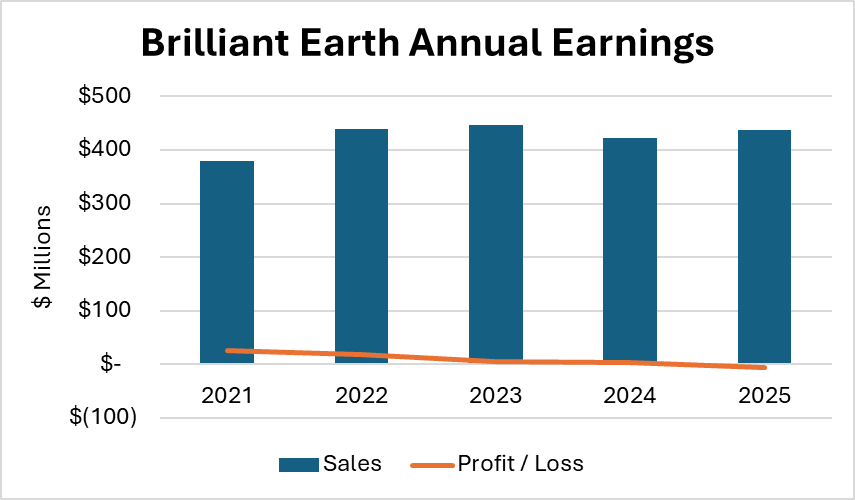 On the other side of the spectrum, Brilliant Earth saw sales increase 4% to $437.5 million during the fiscal year, though it swung to a net loss of $6.4 million from a $4 million profit the previous year. Its model is driven by higher volume, even as average transaction prices decline.