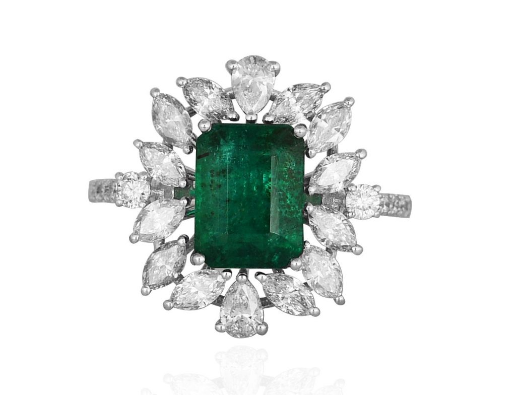 The hero of the ring is the emerald bordered by fancy-cut diamonds. By Savio
