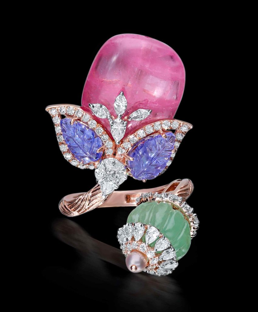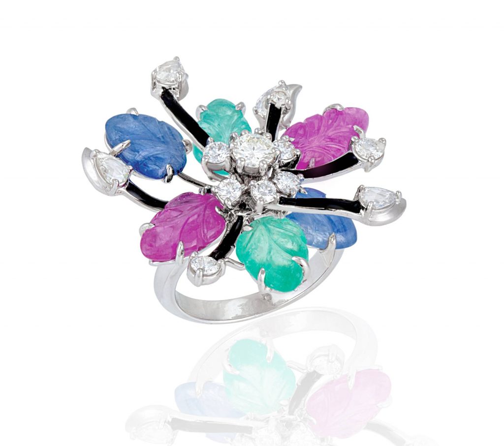 A ring in the form of a bloom shows off petals articulated with carved gemstones and peppered with diamonds. By Wondercuts Fine Jewellery