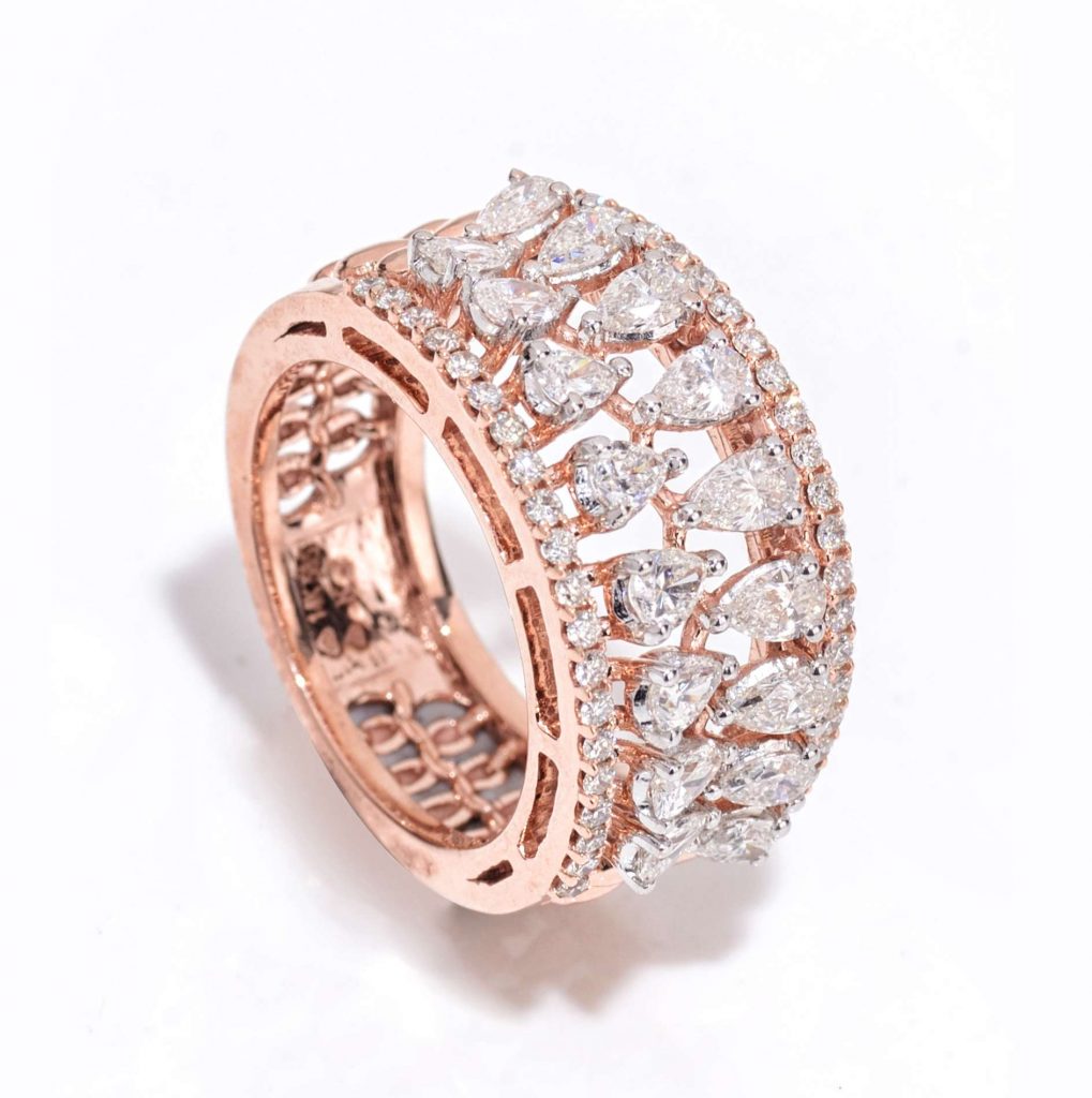 A classy rose gold ring set with pear and round diamonds. By Kulthiaa Jewel