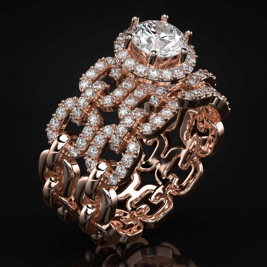 The rose gold cocktail ring with double shanks features diamondset squares with a solitaire at the apex. By Awesome Sparklers