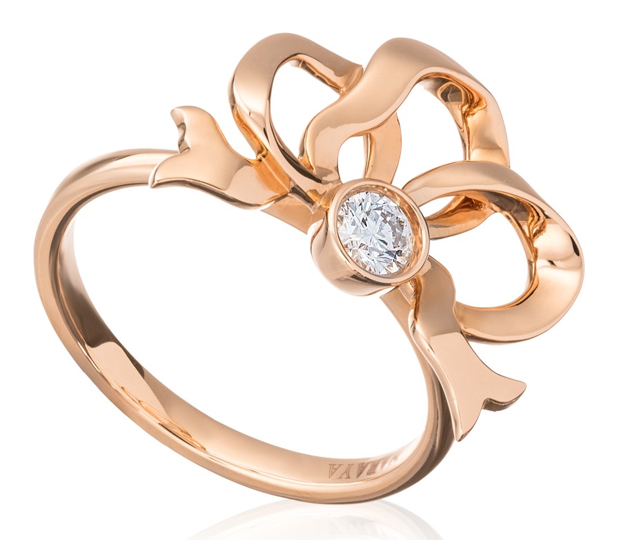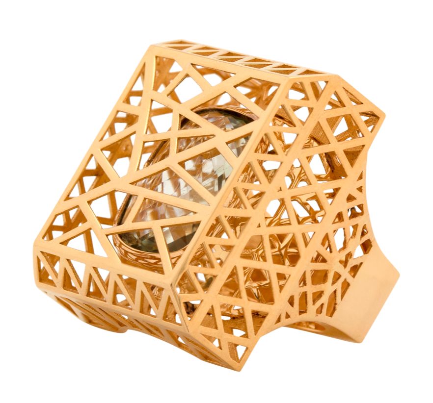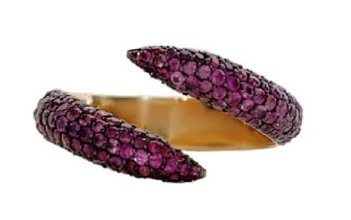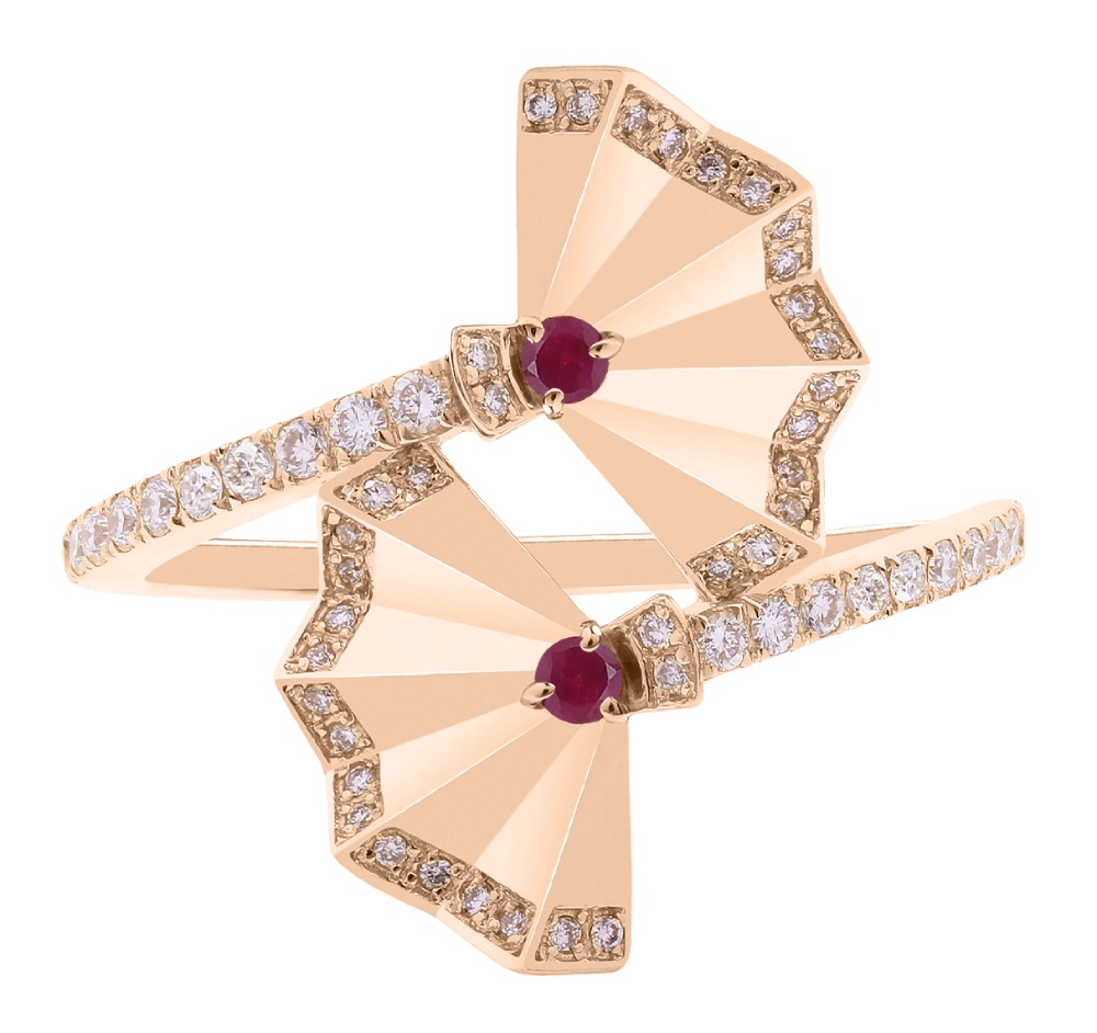 The 18-karat yellow gold Veil ring peppered with diamonds and rubies pays tribute to the garment’s history. By TOKTAM