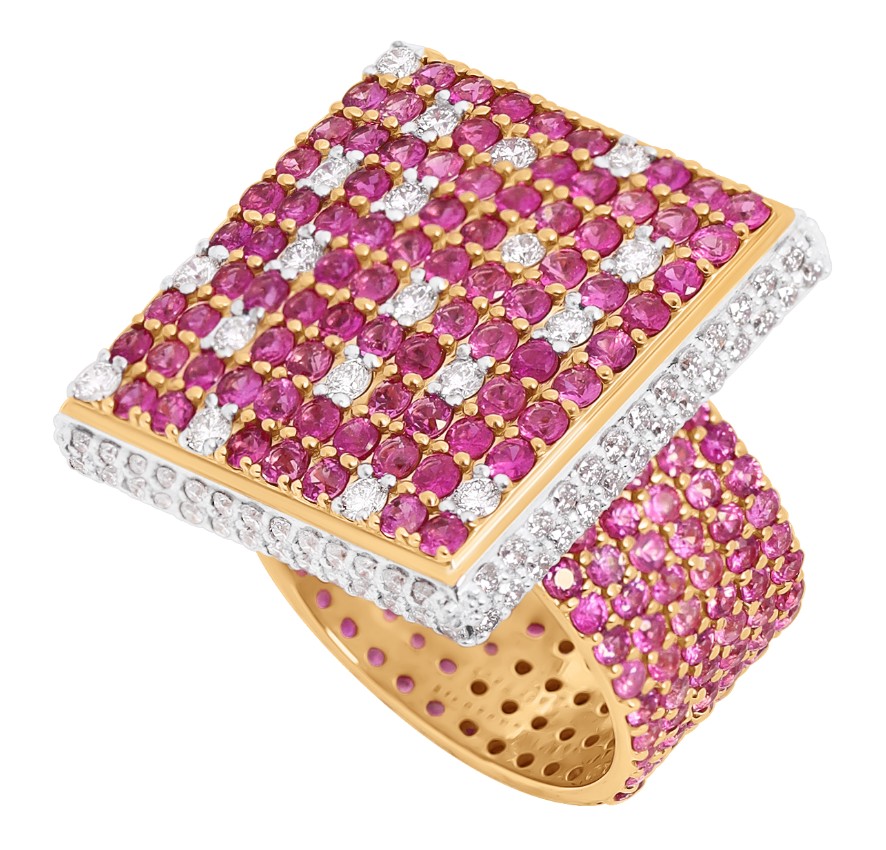 The Spiral ring is crafted in 18-karat gold and saturated with pink sapphires. By STONE FINE JEWELRY