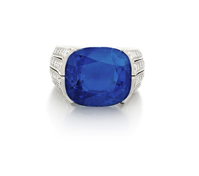 The Cartier ring set with 18.25-carat cushion shape vivid blue sapphire of Burmese origin realised $651,002.