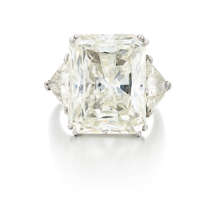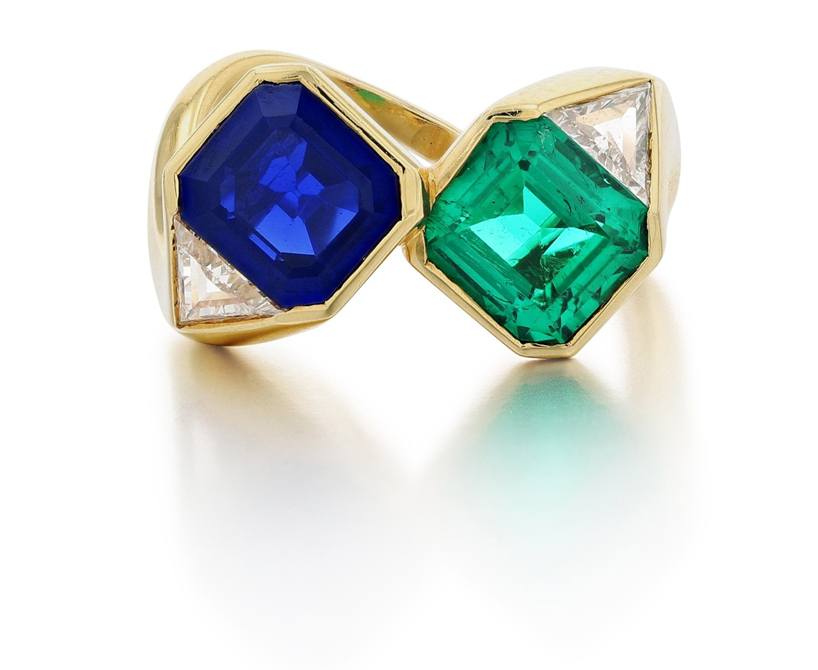 Faraone’s Toi et Moi ring, featuring a step-cut emerald and sapphire flanked by triangular diamonds, went under the hammer for $219,456.