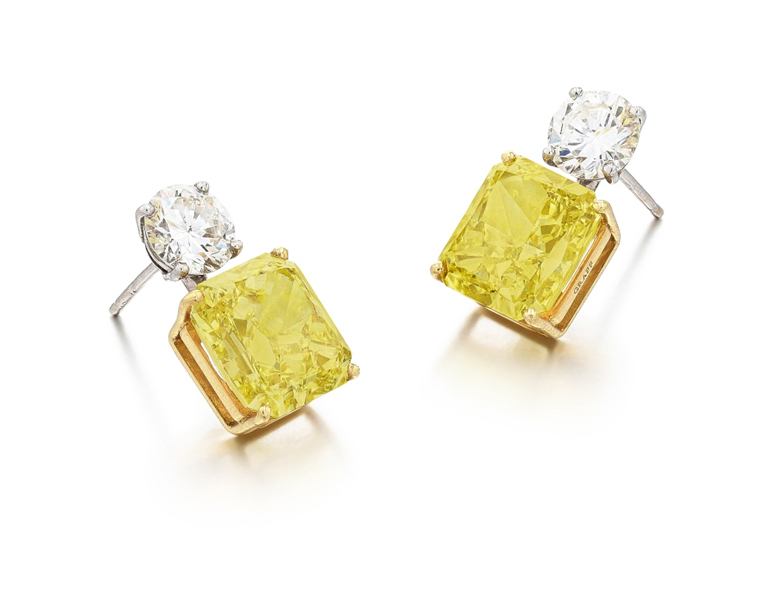 The pair of earrings by Graff, set with Fancy Intense yellow diamonds (6.53 cts and 7.04 cts) realised $205,740.