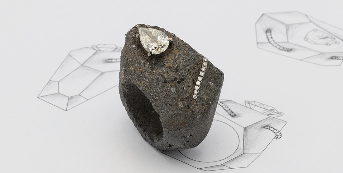 It took us a year to conceptualize and create the Transient Ring. We made it in collaboration with another architect from Material Immaterial, a design firm. It encompasses a two-carat pear-shaped diamond juxtaposed against the raw surface of the concrete with a line of round diamonds encircling it. After the ring was made with the sharp clean edges, we acid-treated it to submit to atrophy – the idea was to relinquish the illusion of control. We “created” the ring by partially destroying it. And it was during our second show in Bombay, when we had put it in that acid bath which is when the collector saw the ring for the first time. That was quite an experience.