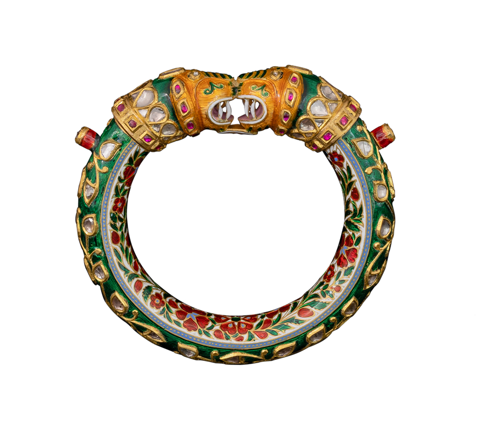 The bracelet’s ‘industrial’ moment was seen in the 19th-20th Century. Screw-fasteners became commonly used in kadas. Traditionally, these kadas, with their thick cylindrical tubes, were designed with large uncut diamonds and gemstones. They were heavy, inflexible, and crafted to fit a fixed wrist size. A simple twist of the screw transformed the rigid kada, letting it open and embrace wrists of varied sizes. “These were hand-made screws. In some instances, a pushpin was also used,” informs Sudhir Kasliwal, Director, Gem Palace, Jaipur. A subtle addition, the screw-fastening closure transformed the kada’s wearability.