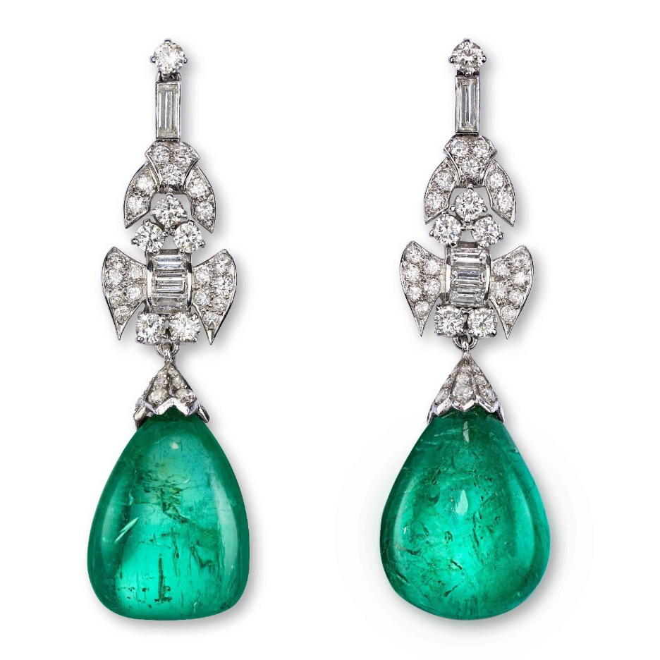 A pair of vintage Colombian emerald & diamond ear pendants realised Rs. 1,57,70,700. © AstaGuru
