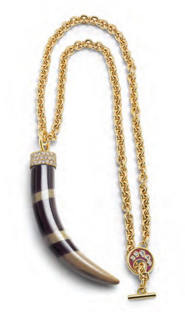 The capsule series of jewels for Canadamark features the Japanese maple leaf motif found on an obi — the sash worn with traditional kimonos — from the Meiji period. The motif is beautifully expressed with sculpted Japanese maple wood (light) and ebony (dark) to create contrast between the tones. The earrings, cuff, ring and necklace are set in 18-karat gold and sprinkled with Canadamark diamonds. “Increasingly, buyers want to know the source of things they buy and specifically in our industry, people want to know that diamonds have been sourced in an ethical way,”said the designer, noted for her marquetry jewels and clutches. “Canadamark demonstrates responsible mining can be done and I am proud to present a capsule collection with a company that abides to such rigorous standards,” added Silvia, who is represented by Muse.