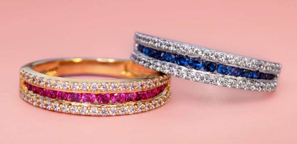 Lotus Jewels (Left) Bridal white gold rings studded with round and fancy-cut diamonds are just the right mark of celebration for the couple; (Right) These slim and striking white and gold bands lined with vibrant rubies, sapphires and brilliant diamonds can be stacked or worn singly.