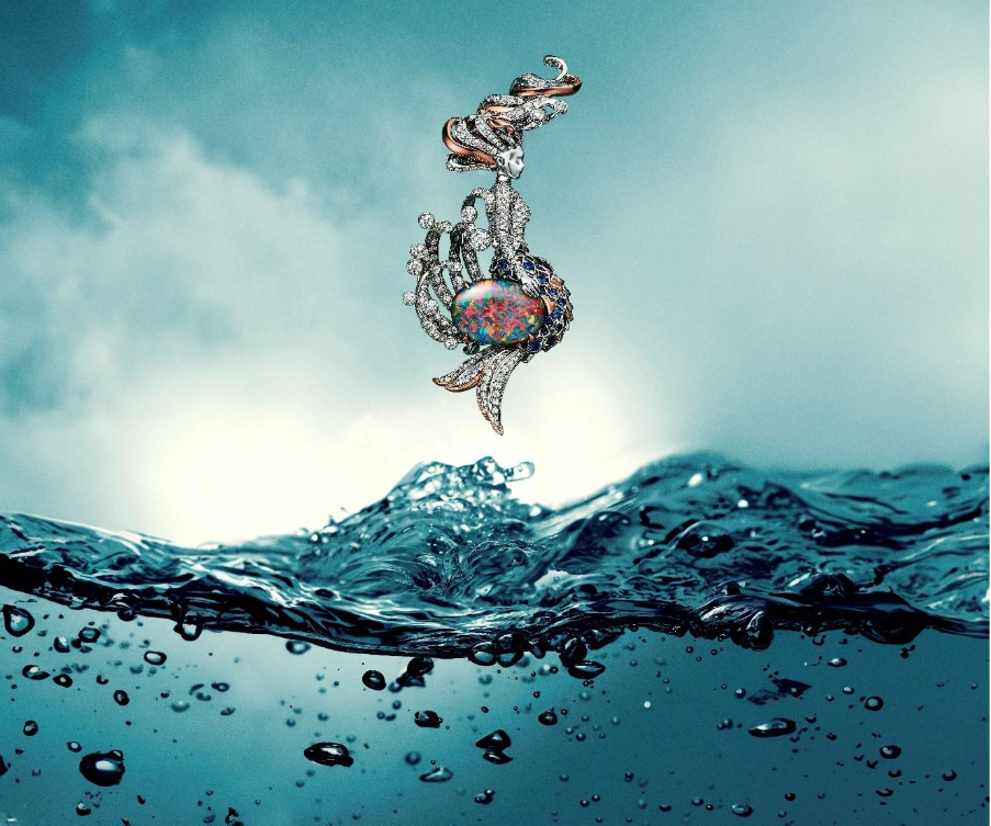 Enchanted by the mythical figure of the mermaid, this chapter explores her allure through Nathalie’s imaginative lens. A brooch in platinum, rose gold and diamonds depicts a mermaid in motion, accented by a black opal of over 10 carats at her fin. The motif continues in an expressive ring, earrings and necklace, each piece a tribute to an underwater fantasy.