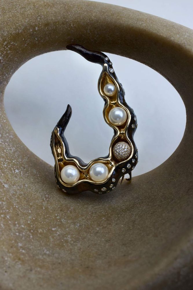 The unusual unisex brooch, shaped like a curled-up dried pea pod, achieves an organic silhouette through the craftsmanship of wood and yellow gold. The pea pod, serving as a symbol of love, care, and protection, is embellished with peas illustrated with lustrous pearls. Notably, one of these peas is uniquely studded with diamonds, adding an extra touch of elegance. The entire pod is peppered with diamonds creating a captivating outer covering.