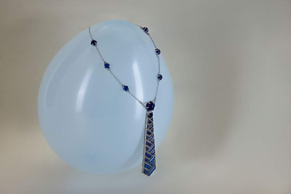 Ever pondered the transformation of a classic tie when worn on a vacation to the French Riviera? Enter The Denim Tie Affair. Inspired by the classic tie, this necklace reinvents the regular accessory with a novel material – denim. Crafted from denim micarta, a durable and distinctive material composed of layers of denim fabric and resin, it lends a captivating texture in various shades of blue. The design celebrates the enduring nature of denim, set with gold, and adorned with diamonds and sapphires.