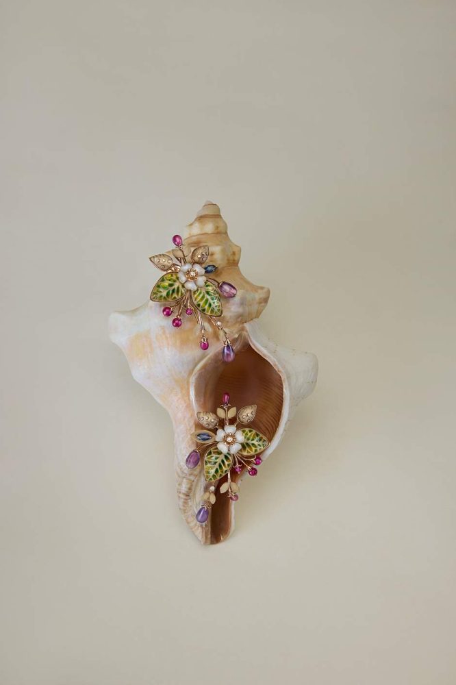 Additionally, gold threads are carefully inlaid within the shell. Tourmaline buds and sapphire fruits add charm to the floral earrings. The meticulous cutting and filing of the shell into smaller petals highlight the skilled artistry involved in fabricating the earrings.
