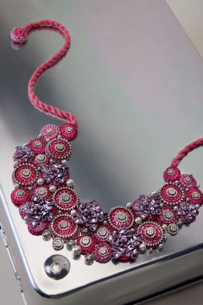 The crocheted necklace is a veritable tapestry of creativity, densely populated with vibrant coloured lacy blooms of different sizes that captivate the beholder. The mesh blooms are complemented by tiny florets composed using pink rhodium, enhancing the overall allure of the necklace.