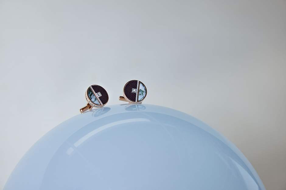 The reversible half-and-half cufflinks blend style with innovation. Crafted from fine leather, moss agate, gold and diamonds, the ultra-modern pair of cufflinks features a discreetly positioned SIM card chip tying up fashion and function, past and present, as well as art and technology.